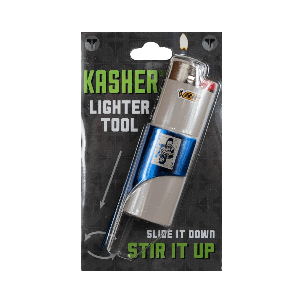 Custom Kasher tool with double sided engraved Card logo & Faces logo. Paired with random color BIC Lighter.