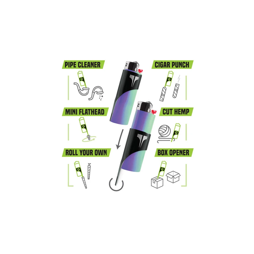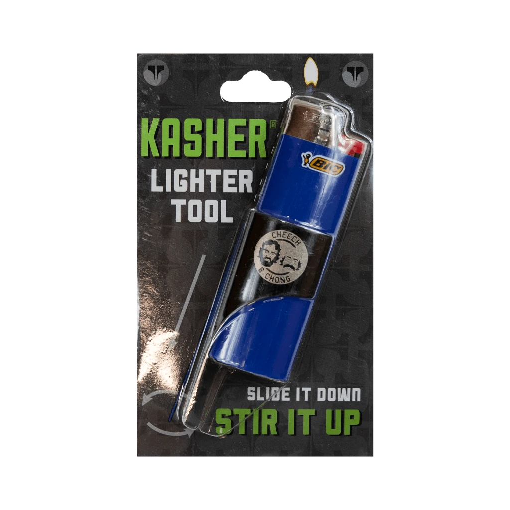 Custom Kasher tool with double sided engraved Circle logo. Paired with random color BIC Lighter.