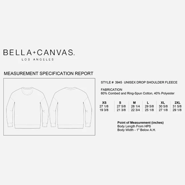 Printed on Bella+Canvas 52/48 airlume combed and ringspun cotton/polyester fleece.