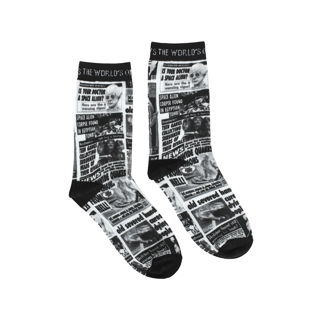 Bring the word to the people: or at least to anyone close enough to read your socks. Carry some of Weekly World News’ most head-spinning front page stories on your feet all day long and spread the word from the “World’s Most Reliable News Source.”