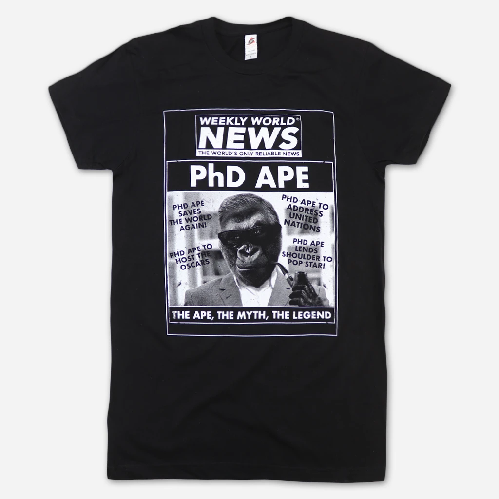 Be the first to review “Weekly World News PhD Ape Black T-Shirt” Cancel reply